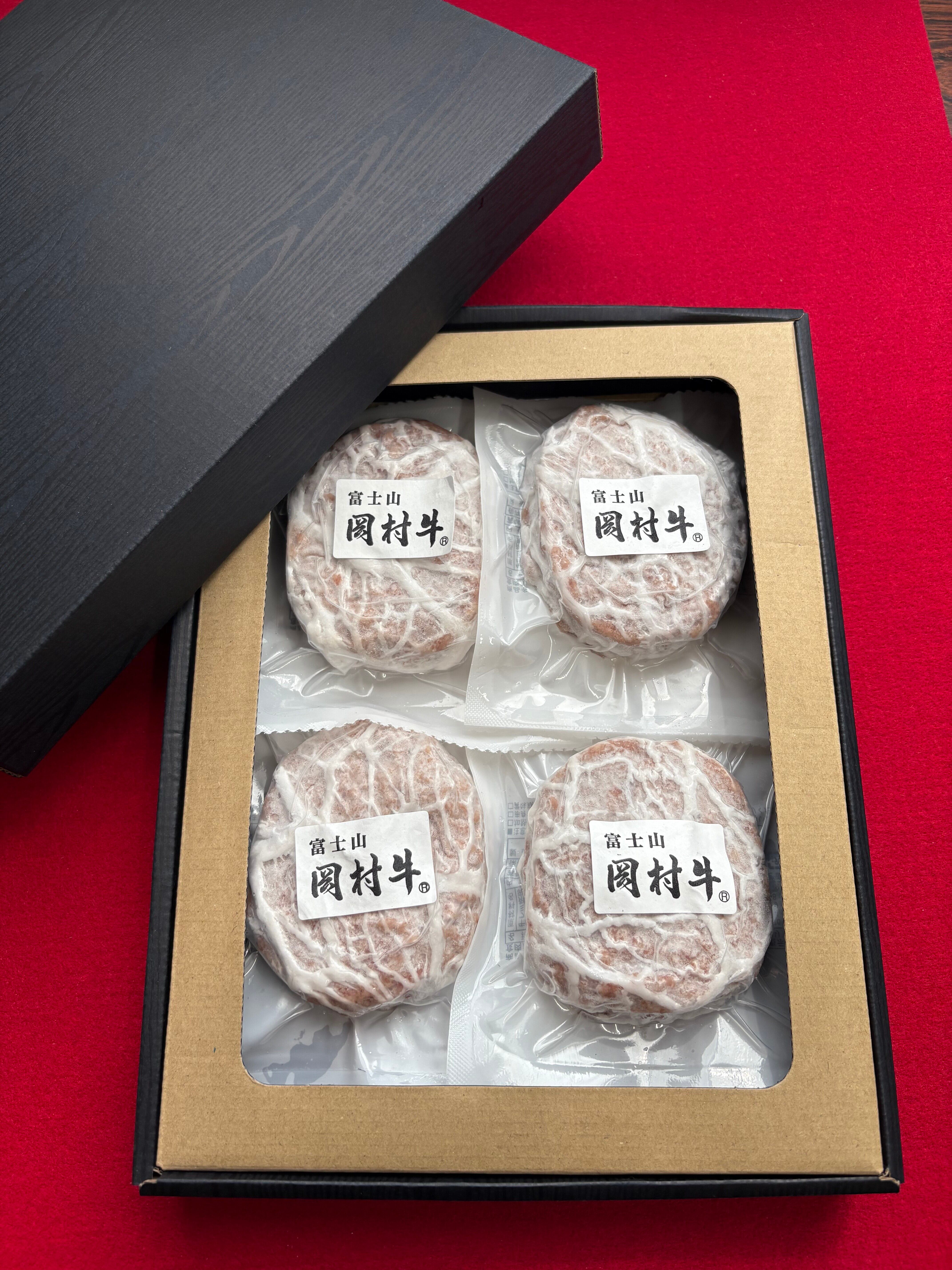 富士山 岡村牛ハンバーグ 130g×4枚 オニオンソース4袋つき 贈答用箱入り 世界遺産の麓で育まれた上質な肉質と本物の味をあなたに 化粧箱入りでギフトにも最適 | すぎもとミートONLINE 至福のひとときを彩る究極のハンバーグをご賞味ください