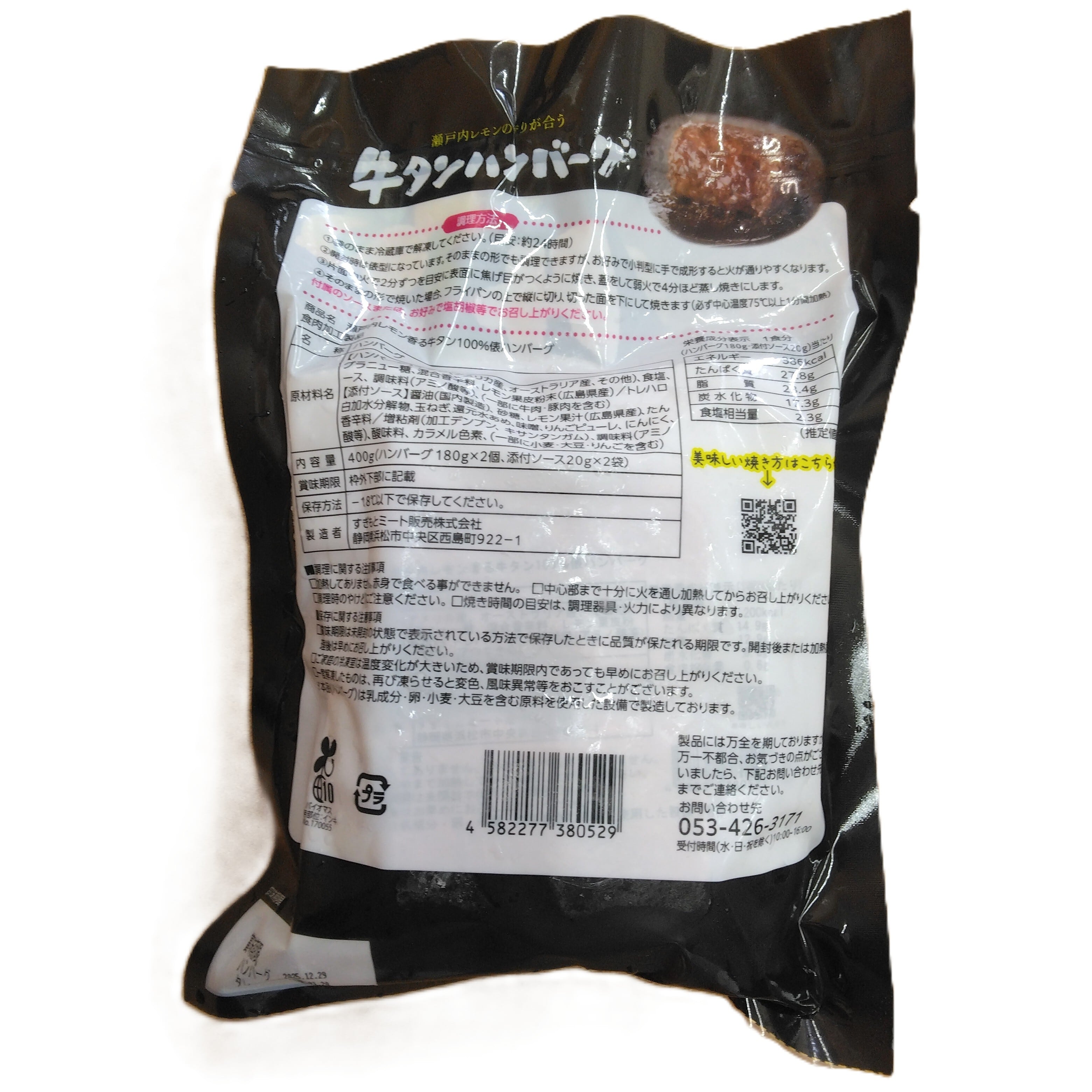 【ハンバーグ】牛タン(アメリカ産、オーストラリア産、その他)、食塩、グラニュー糖、混合調味料、レモン果皮粉末(広島県産)/トレハロース、調味料(アミノ酸等)、(一部に小麦、大豆、りんごを含む)