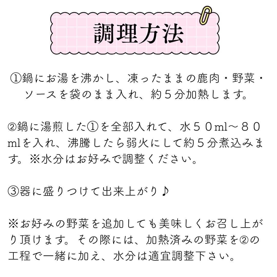 ①鍋にお湯を沸かし、凍ったままの鹿肉・野菜・ソースを袋のまま入れ、約5分加熱します。