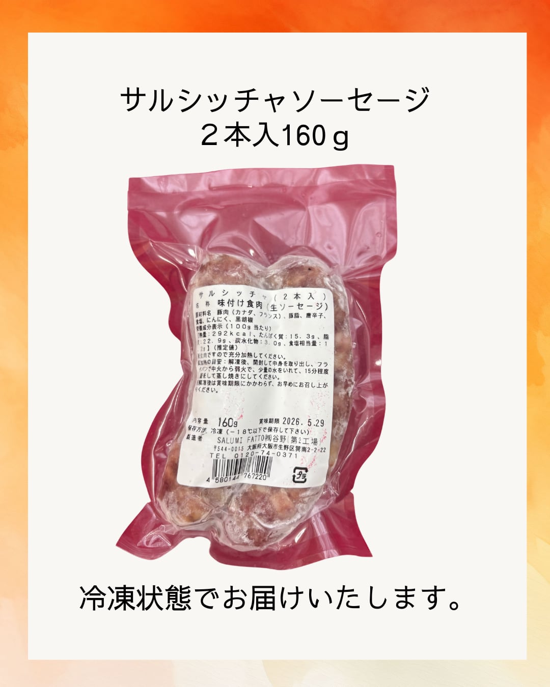 原材料:豚肉(カナダ、フランス)、豚脂、唐辛子、食塩、にんにく、黒胡椒